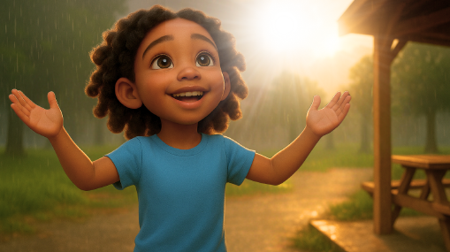 After the rain stopped, the girl stepped out into the sunshine again. She smiled big and lifted her hands toward the sky.