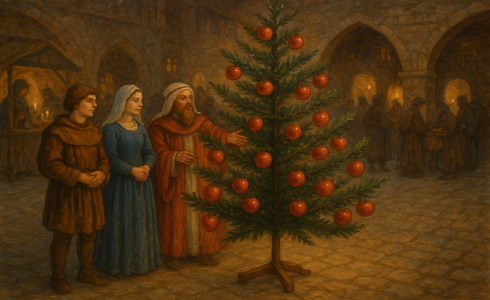 Tree, began in Europe. On Christmas Eve, Christians celebrated the holiday by acting out key events from Scripture. One of the most beloved skits was the Garden of Eden scene. Because apple trees do not bear fruit in winter, an evergreen tree was used instead. Actors would hang apples on these