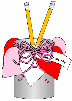 What You Do: Punch two holes into the center of the hearts. String the hearts onto the raffia. Wrap around the can and tie to secure. Wrap the ends of the raffia to the opposite side of can and string the "Jesus Loves Me" label onto it. Finish with a bow. You might want to use hot glue to hold the hearts in place. (Have an adult operate the glue gun.)
