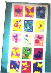 New Life themed shapes. Arrange the shapes on the colored paper and glue them on. Allow everyone to create their own design. Glue the individual works of art onto the butcher paper. Glue or staple the butcher paper onto the banner paper. Wrap the ends of the banner paper around the dowel. Staple shut. Tie the cord to both ends of the dowel. Hang and display your beautiful Paper Quilt!