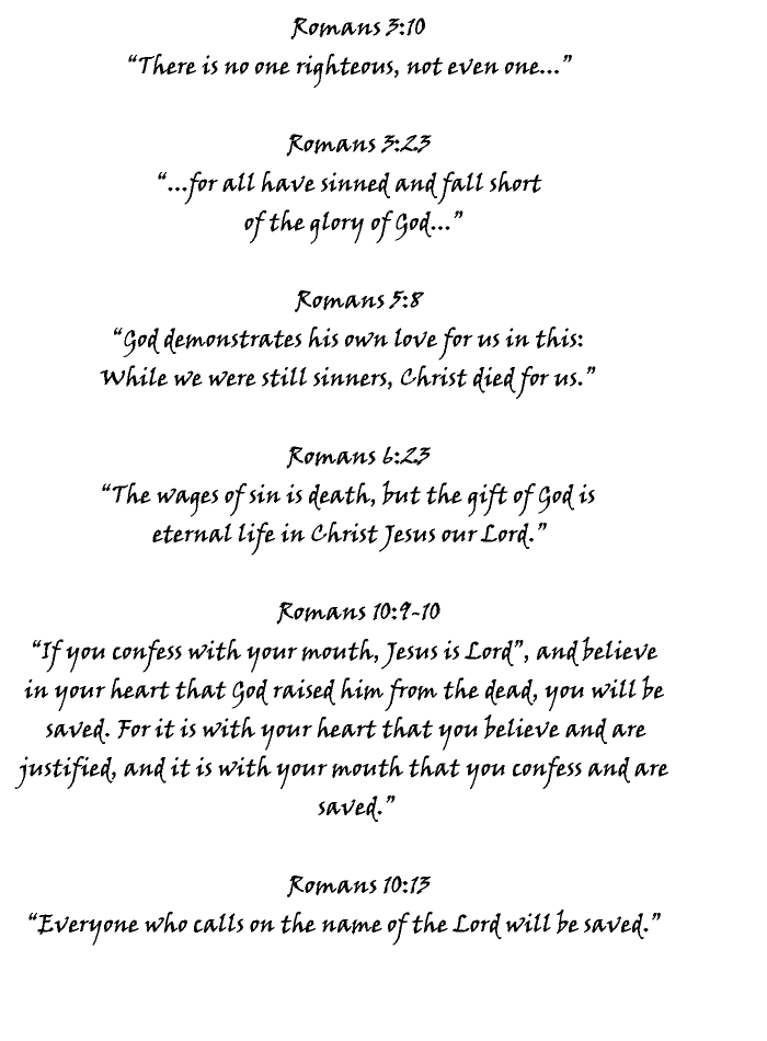 The Roman Road is an evangelistic tool to help you share your faith in Jesus. Here's what you do, write Romans 3:10 at the beginning of the book of Romans. Beside Romans 3:10, write the next verse, Romans 3:23. Beside Romans 3:23, write Romans 6:23, and so on. This way, you can share the Roman Road from your own Bible with anyone, at anytime!