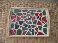 What You Do: Evenly spread grout into tray, approximately 1/8" thick. Press ceramic pieces into grout. Do not allow more than 1/2" between the pieces. Your design can be abstract as shown in the pictures above, or a representative design. Allow to dry about 24 hours. Apply grout over ceramic with spreader to fill cracks. Begin wiping top of ceramic off with