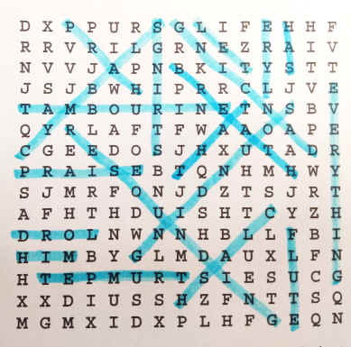Find and circle or highlight the underlined words in our Psalm 150 Word Search Praise Puzzle. The words are listed frontwards, backwards, vertically, horizontally, and diagonally.