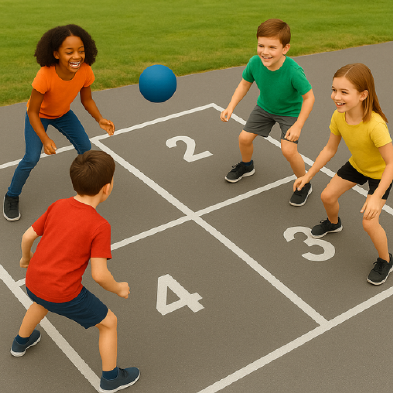 How To Play: The game begins with four players, each one standing in one of the four squares. The rest of the class lines up behind position #4. Player #1 begins play.