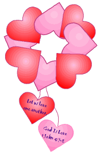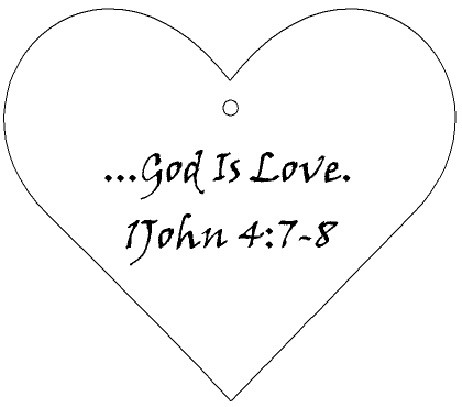 "Let us love One Another" (John 13:34) on the first dangling heart, and, "God Is Love"